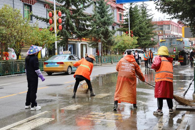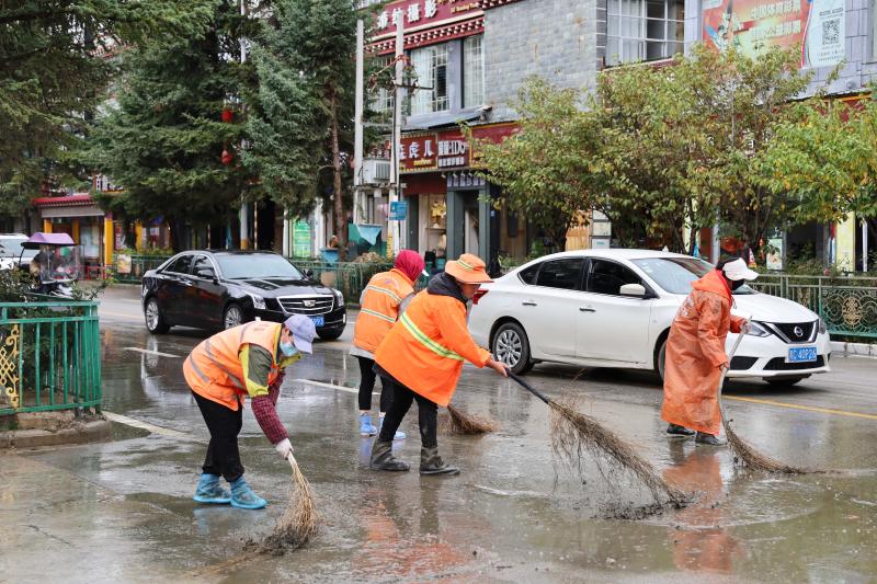 為盡快恢復(fù)城區(qū)潔凈容貌,香格里拉市和祥環(huán)??萍加邢挢?zé)任公司立即組織環(huán)衛(wèi)工人30名,抽調(diào)高壓水車2輛、掃地車4輛,積極開展道路清淤工作,同時對下水道水口周邊的樹枝、雜物等進行清理清運。經(jīng)過近五小時的連續(xù)作業(yè),成功恢復(fù)道路暢通整潔。
