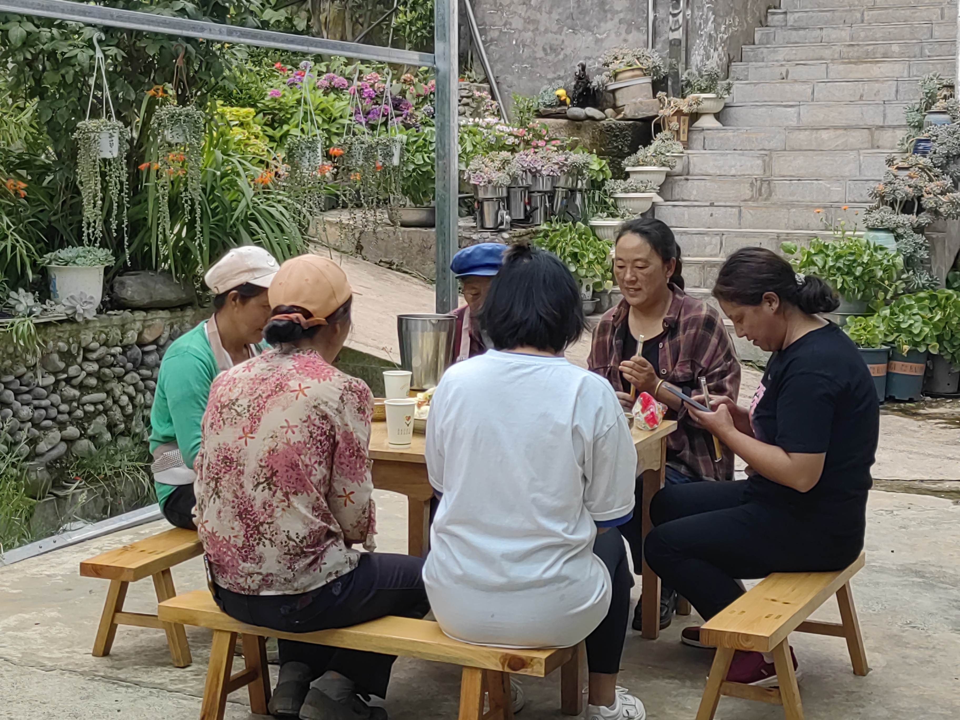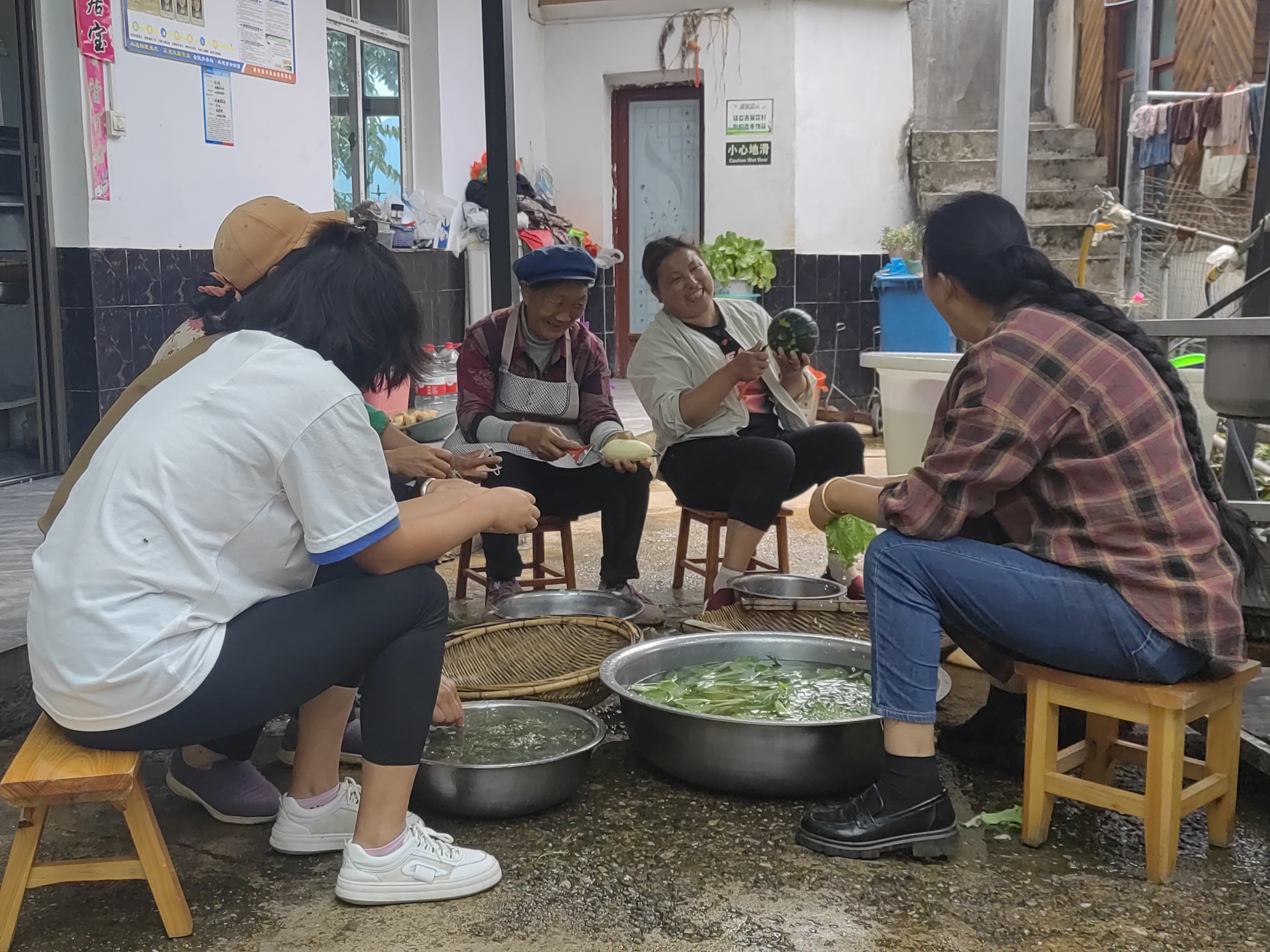 村口,一個(gè)名叫“成姐農(nóng)家樂(lè)”的小院里歡聲笑語(yǔ),熱鬧非凡?!斑@是今天剛挖的洋芋和新鮮采摘的瓜,待會(huì)就給客人做一道當(dāng)?shù)氐奶厣恕瞎涎笥??!薄盁豕瞎涎笥蟮臅r(shí)候,再做個(gè)鍋邊粑粑,這樣的農(nóng)家味道客人肯定喜歡?!痹谵r(nóng)家樂(lè)里忙碌的姐妹們邊洗菜邊討論著當(dāng)天的菜品。