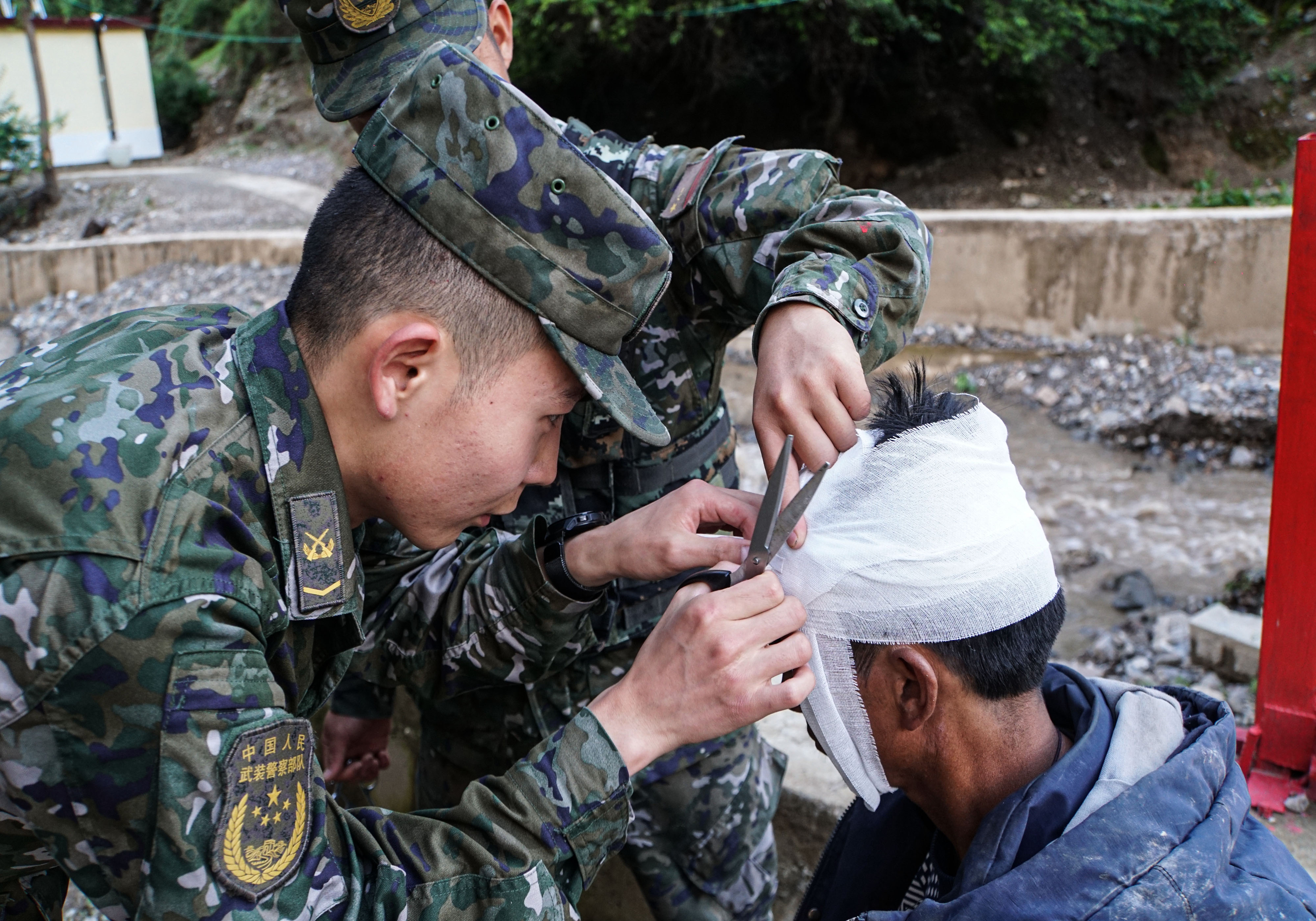 據(jù)知情人介紹8月31日下午,武警云南總隊(duì)某中隊(duì)哨兵張流成在執(zhí)勤時(shí)發(fā)現(xiàn),營(yíng)區(qū)附近一輛貨車通過路橋時(shí)突遇路橋坍塌,車輛掉入河溝,情況十分危機(jī)。事發(fā)緊急,時(shí)間就是生命!張成流立即向值班室報(bào)告,軍醫(yī)甕云飛及部分官兵在政治指導(dǎo)員李洪才的指揮下協(xié)力將受傷司機(jī)從駕駛室救出,并攙扶到安全地帶,甕云飛第一時(shí)間對(duì)司機(jī)的傷勢(shì)進(jìn)行檢查。