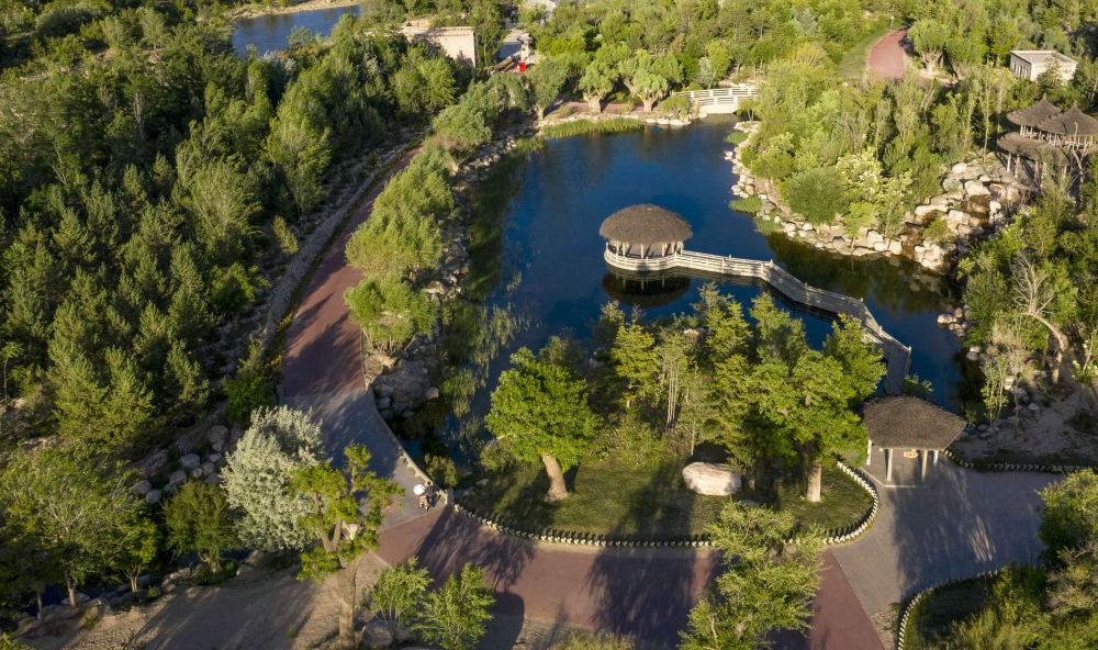 坐落在寧夏銀川市賀蘭山腳下的賀蘭山運動休閑公園(2021年5月27日攝,無人機照片)。這里曾是一片砂石采礦塌陷區(qū),當?shù)赝ㄟ^植被景觀再造、水系建設(shè)、現(xiàn)代管網(wǎng)鋪建等手段,重新利用廢石、廢坑及各類廢棄建筑材料,把這里變成一座免費開放的主題公園。新華社記者 馮開華 攝