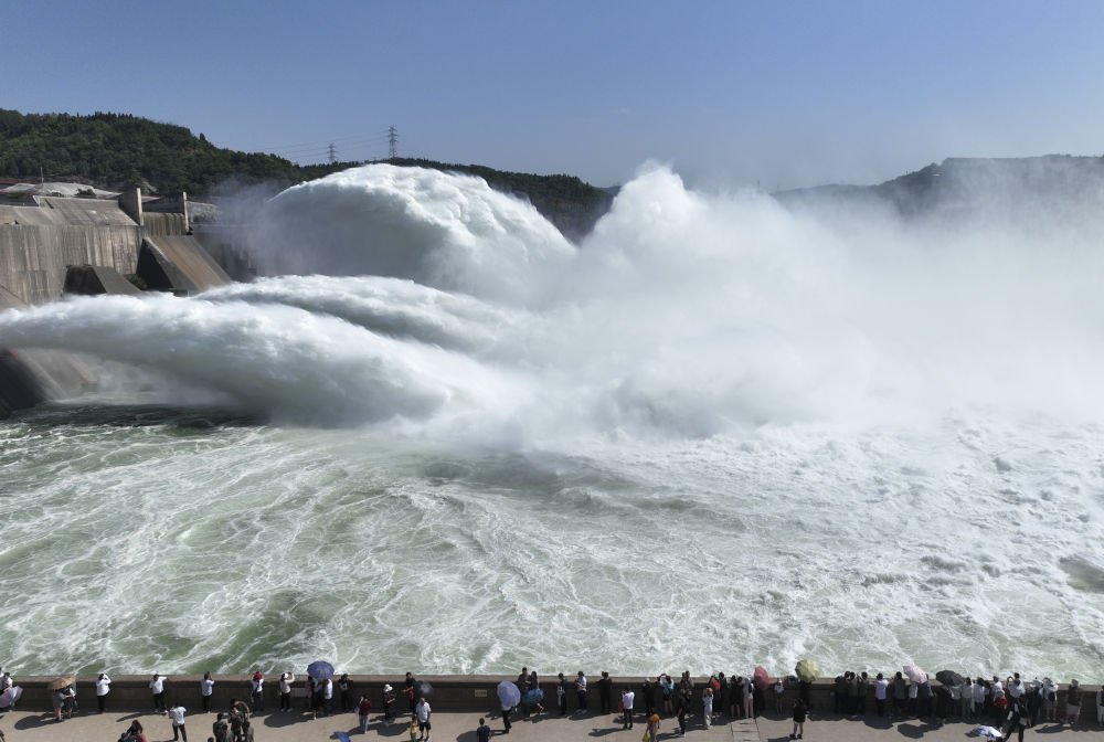 2023年6月23日,游客在黃河小浪底水利樞紐工程出水口觀看調(diào)水調(diào)沙(無人機照片)。新華社發(fā)(苗秋鬧 攝)