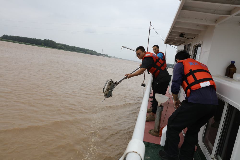 2023年6月29日,調(diào)水調(diào)沙期間,黃河下游利津水文站工作人員在進行取沙作業(yè)。新華社記者 劉詩平 攝