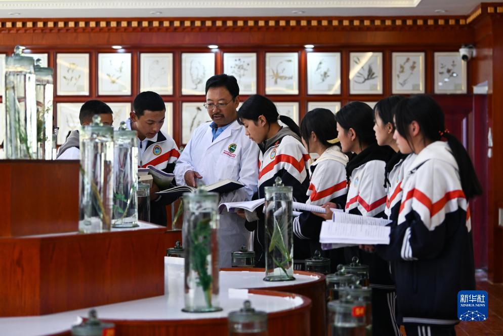 9月8日,在果洛藏族自治州職業(yè)技術學校,藏醫(yī)醫(yī)療與藏藥專業(yè)學生在草藥標本館內(nèi)學習辨認藥材。新華社記者 張龍 攝