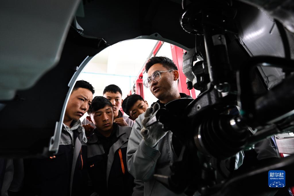 9月8日,在果洛藏族自治州職業(yè)技術學校,汽車運用與維修專業(yè)學生在實訓課程上學習。新華社記者 張龍 攝