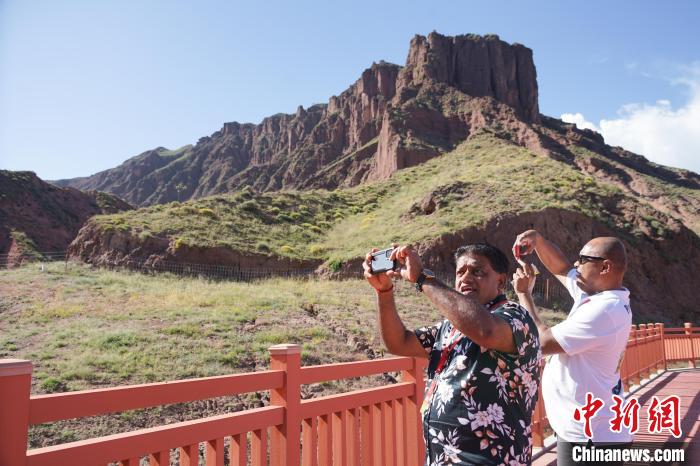 圖為兩位外國政黨代表團成員在坎布拉國家地質(zhì)公園內(nèi)拍攝丹霞地貌。馬銘言 攝