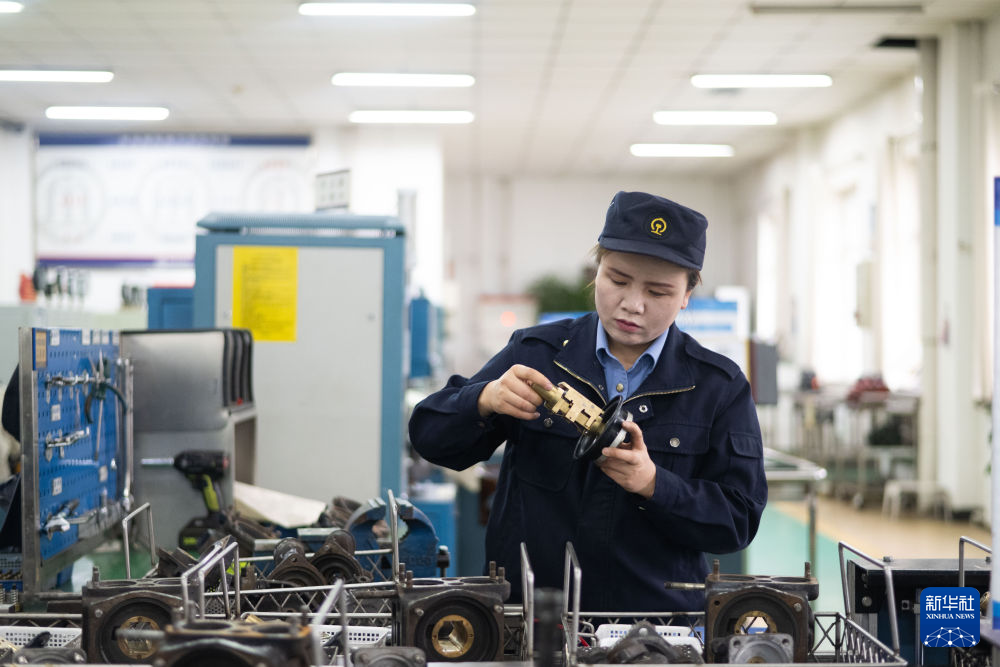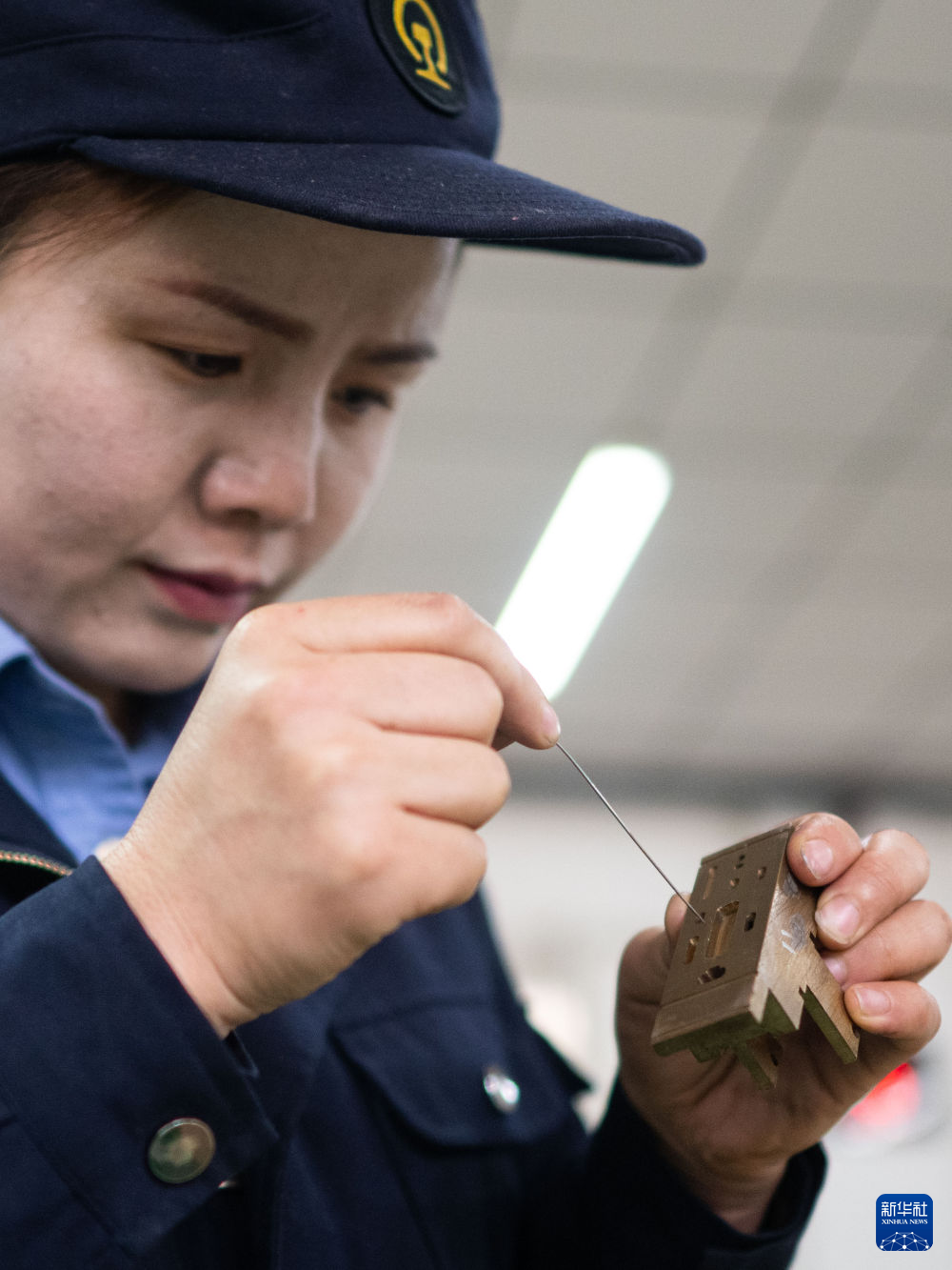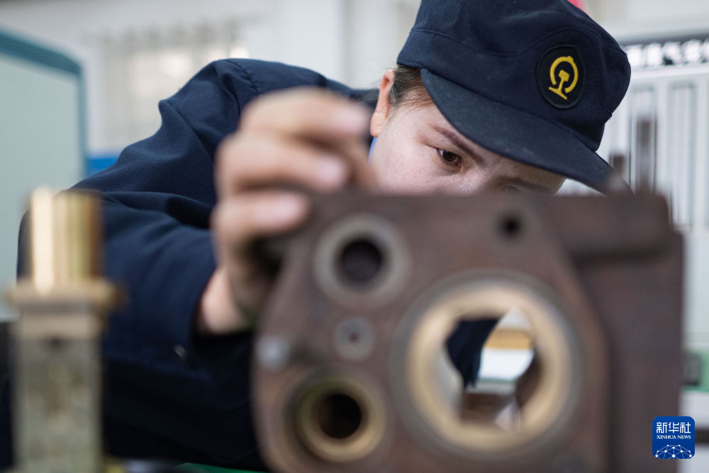 10月12日,在中國鐵路青藏集團(tuán)有限公司西寧東車輛段制動班組,馬婷對120閥滑閥內(nèi)部通路進(jìn)行疏通。新華社記者 張龍 攝