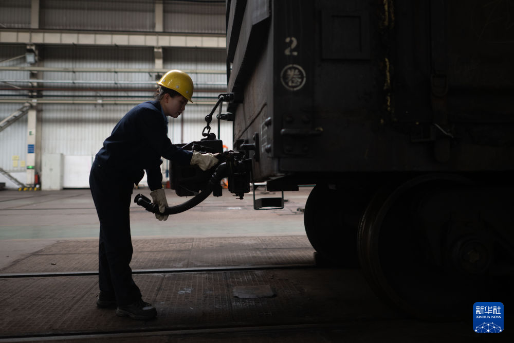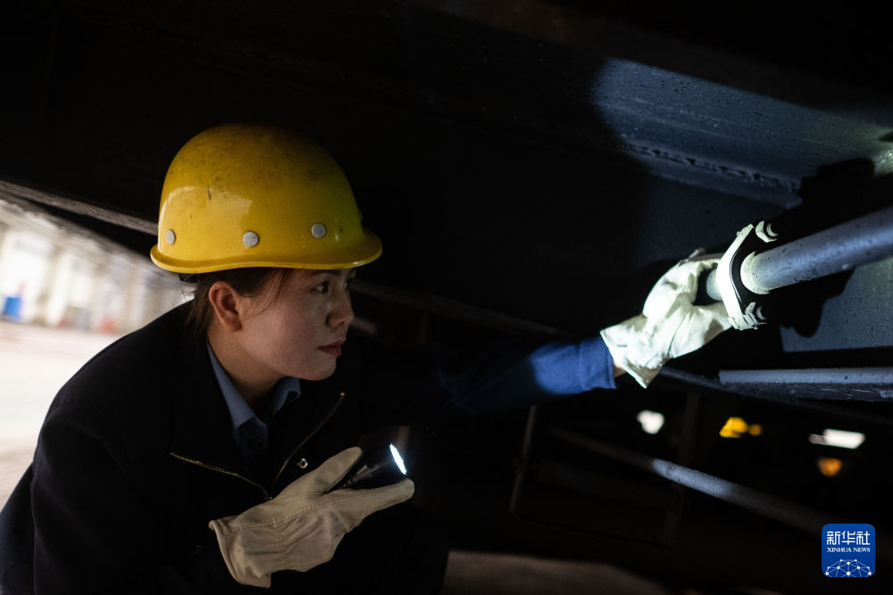10月12日,在中國鐵路青藏集團(tuán)有限公司西寧東車輛段制動班組,馬婷在檢查貨車車輛制動軟管。新華社記者 張龍 攝
