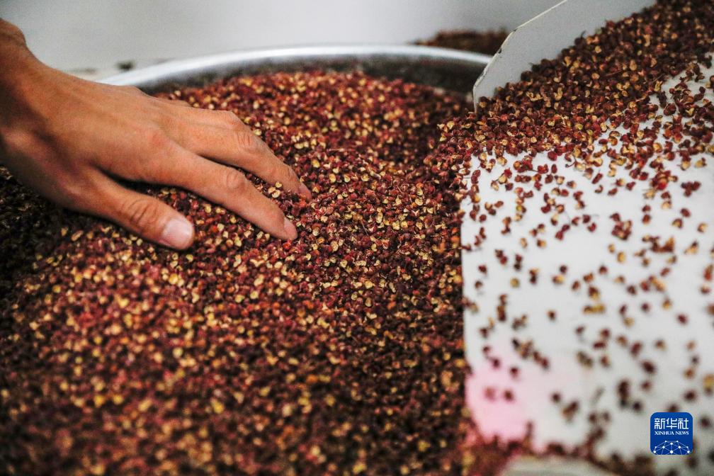 11月15日,在舟曲縣電子商務公共服務中心,工作人員將花椒倒入篩選機。新華社記者 方欣 攝