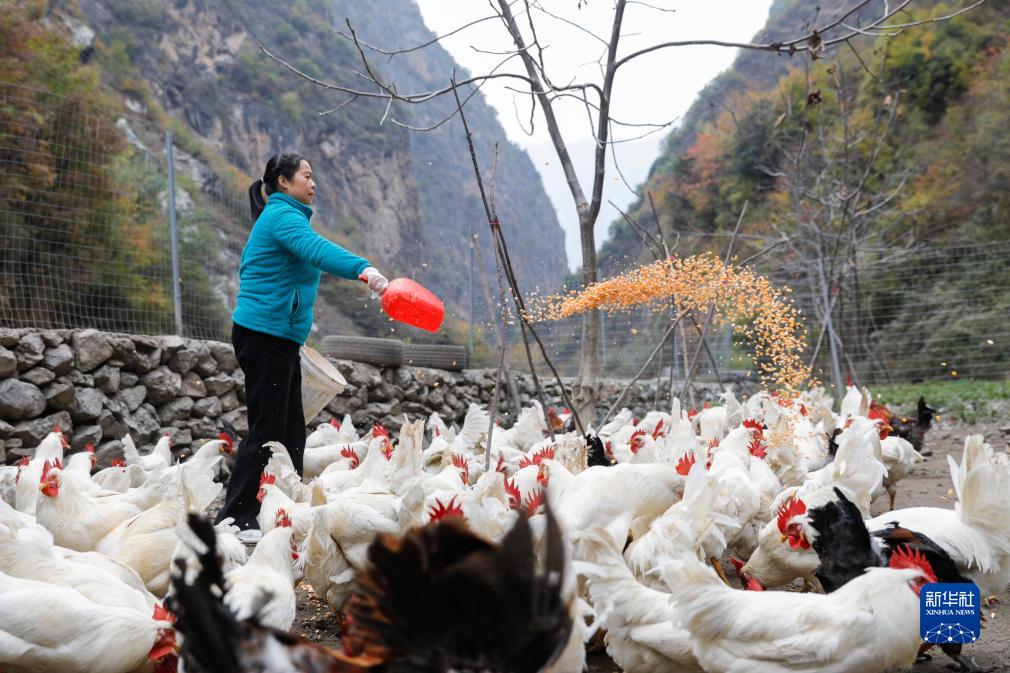 11月15日,在舟曲縣峰迭鎮(zhèn)狼岔壩村,村民在喂土雞。新華社記者 方欣 攝