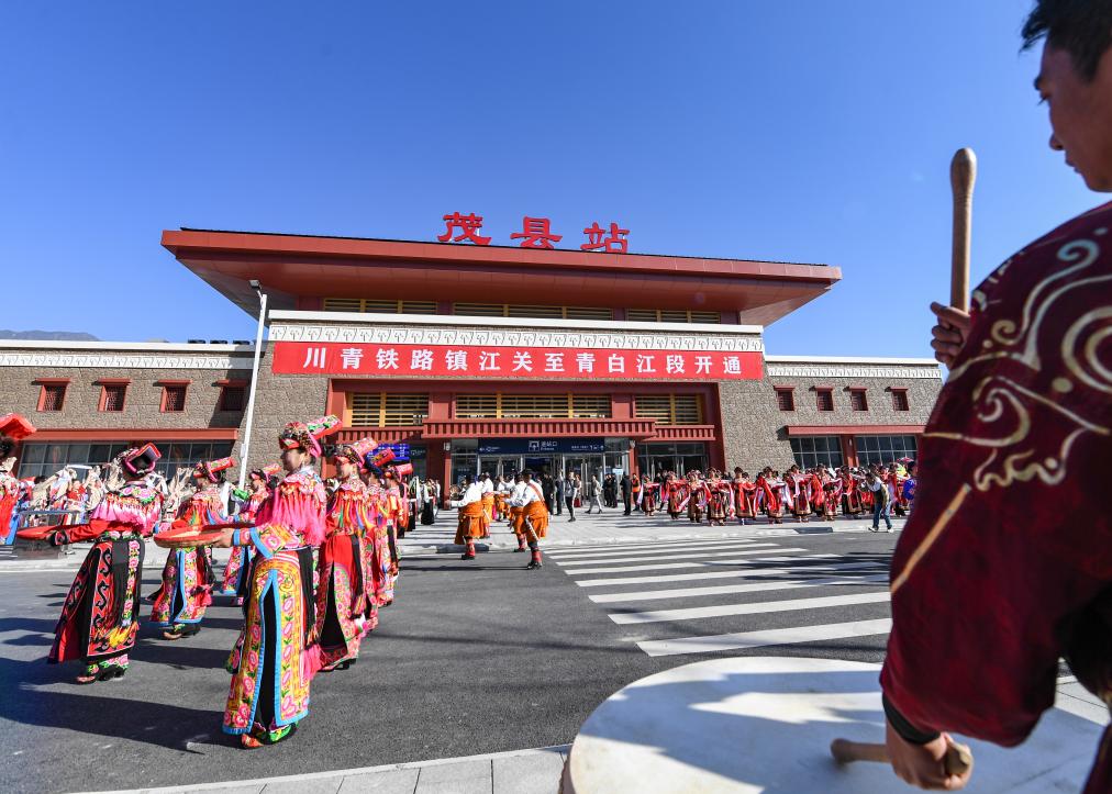 11月28日,在川青鐵路茂縣站,當?shù)馗髯迦罕娫谡厩皬V場慶祝鐵路開通運營。 新華社記者 王曦 攝