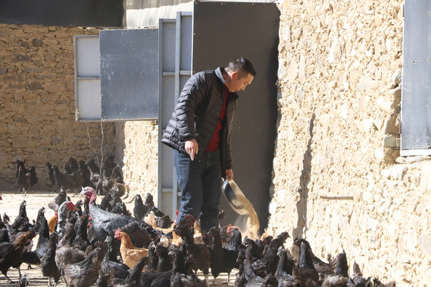 “我們這里的雞都是放養(yǎng),也會(huì)給它們喂一些發(fā)酵后的酒糟、玉米等,這樣養(yǎng)出的藏香雞肉質(zhì)鮮美、緊實(shí),不愁賣不出。雞場(chǎng)常規(guī)存欄量在一萬一千羽左右,目前還有7000多羽,其中蛋雞近2000羽?,F(xiàn)在天氣冷,蛋雞每天可以產(chǎn)800到1000枚雞蛋,平時(shí)高峰期,日產(chǎn)蛋基本在1500枚左右?!苯?jīng)過全身消殺,李厚新帶著我們走進(jìn)位于木拉鎮(zhèn)曲呷村的藏香雞養(yǎng)殖場(chǎng)。