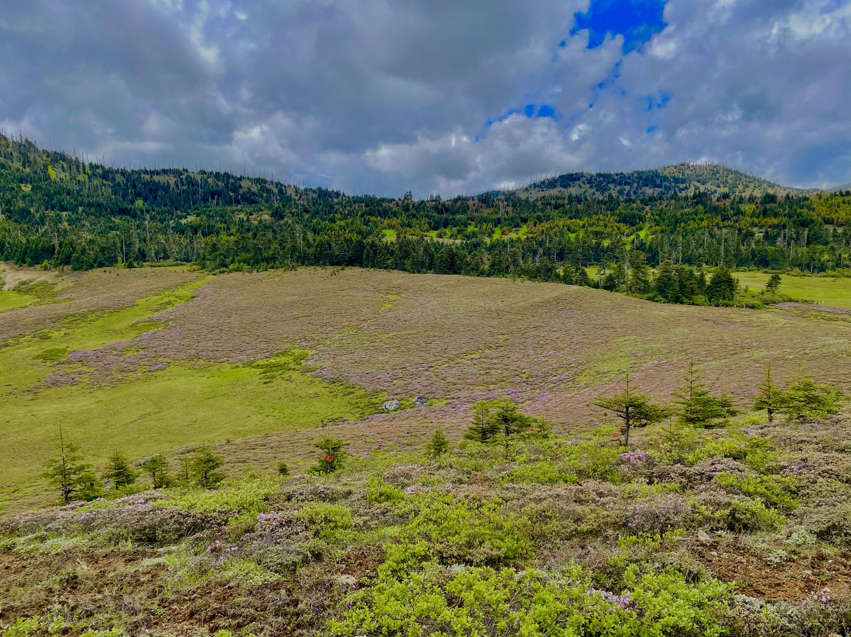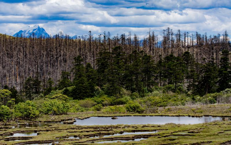 千湖山藏語稱“拉姆冬措”,意為神女千湖或仙女千湖,以三碧海、大黑海為中心,向四周散開。千湖山上共有大大小小近300個(gè)高山湖泊,堪稱云南高山湖泊最集中的地方。千湖山的湖有的圓若明鏡,有的長似游魚;有的開闊平坦,有的幽深寧靜;有的半環(huán)于山洼深處,有的掩映于杜鵑叢中;有的似珠玉成串,有的孤懸于草甸中間;有的怪石露出如鱷魚探頭,有的水色深沉似無底深淵……真是千姿百態(tài)。千湖山周圍被原始森林所覆蓋,多為高大筆直的冷杉、云杉。湖畔長滿了杜鵑林,多是黃杜鵑、紅杜鵑和白杜鵑,花冠碩大,色澤鮮艷。