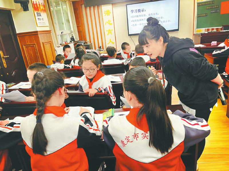 9月20日,在康定市實驗小學,都江堰市支教教師(右一)指導(dǎo)學生閱讀。
