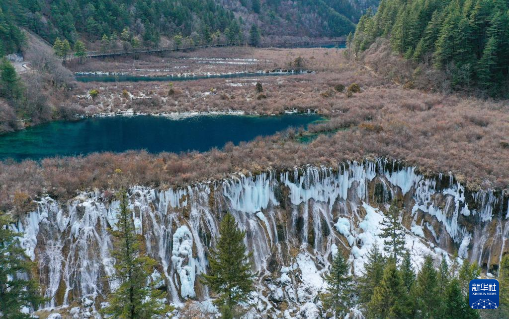 這是1月4日在四川省九寨溝風(fēng)景名勝區(qū)拍攝的諾日朗瀑布形成的冰瀑景觀(無人機(jī)照片)。新華社記者 王曦 攝