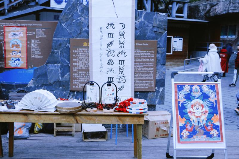 圖為非物質(zhì)文化傳承人和桂全現(xiàn)場演示納西族傳統(tǒng)造紙術(shù),展示東巴畫、十二生肖布畫、東巴鼓等非遺產(chǎn)品,并免費為游客寫東巴文、畫十二生肖。