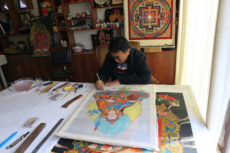 科考隊(duì)對(duì)玉科鎮(zhèn)的歷史街巷、傳統(tǒng)民居,進(jìn)行了系統(tǒng)的勘測(cè)和記錄。并對(duì)玉科鄉(xiāng)村遺產(chǎn)中活態(tài)延續(xù)的非物質(zhì)文化技藝與人居環(huán)境的共生關(guān)系,進(jìn)行了系統(tǒng)的走訪調(diào)研。在返鄉(xiāng)畫(huà)師、州級(jí)非物質(zhì)文化傳承人呷瓦家中,科考隊(duì)看到了繪制在絲絹上的唐卡。呷瓦早先曾在北京游藝,深受當(dāng)?shù)匚幕绊懀笠蚣亦l(xiāng)的鄉(xiāng)村文旅發(fā)展火熱,就帶著滿(mǎn)心的故土鄉(xiāng)愁回到家鄉(xiāng)授徒創(chuàng)業(yè)。在家鄉(xiāng),呷瓦把藏族傳統(tǒng)唐卡繪畫(huà)與中國(guó)傳統(tǒng)的水墨畫(huà)相融合,首創(chuàng)了這樣創(chuàng)新的畫(huà)法。