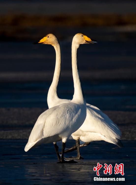 多只天鵝在湖冰上嬉戲。青??婶斂撕?托素湖省級自然保護區(qū) 供圖