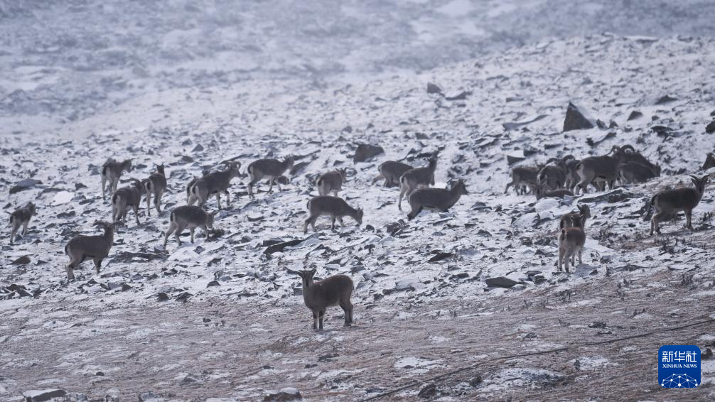 1月23日,幾只巖羊在青海省海北藏族自治州門(mén)源回族自治縣境內(nèi)的崗什卡雪峰活動(dòng)。新華社記者 張龍 攝