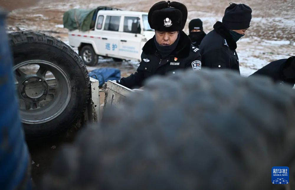 在可可西里可考湖區(qū)域附近,可可西里森林公安局不凍泉派出所所長詹江龍(左一)準(zhǔn)備搬運(yùn)生活物資(1月19日攝)。新華社記者 張宏祥 攝