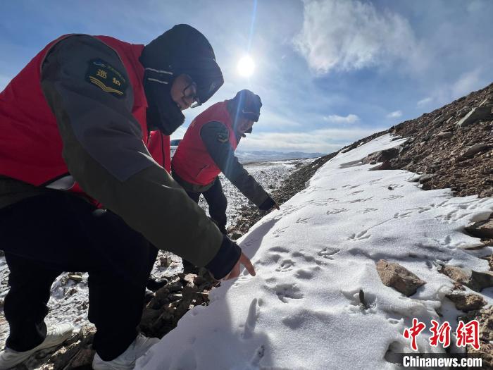 1月24日,管護員在巡護路上發(fā)現(xiàn)野生動物留下的腳印。中新社記者 李江寧 攝
