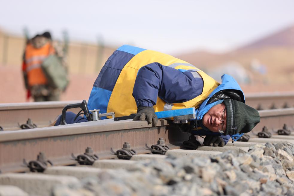 張福強趴在鐵軌上檢查線路情況。(中國鐵路青藏集團有限公司格爾木工務(wù)段提供)
