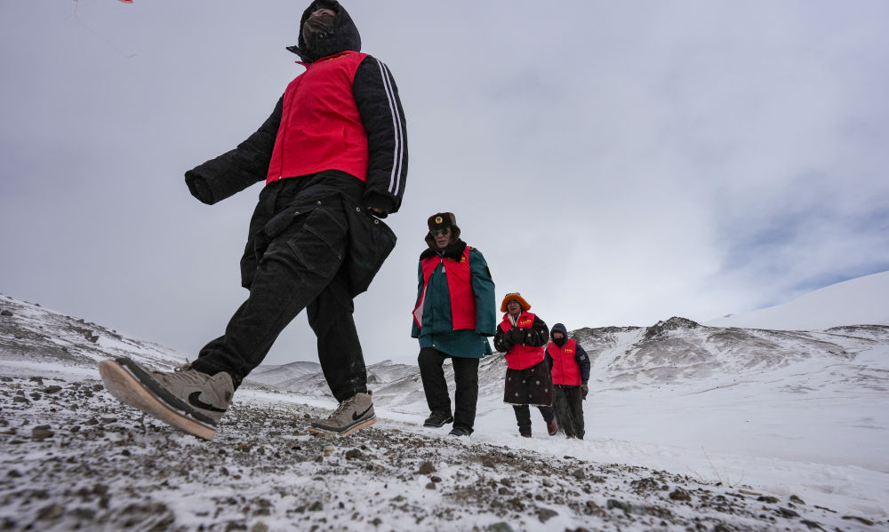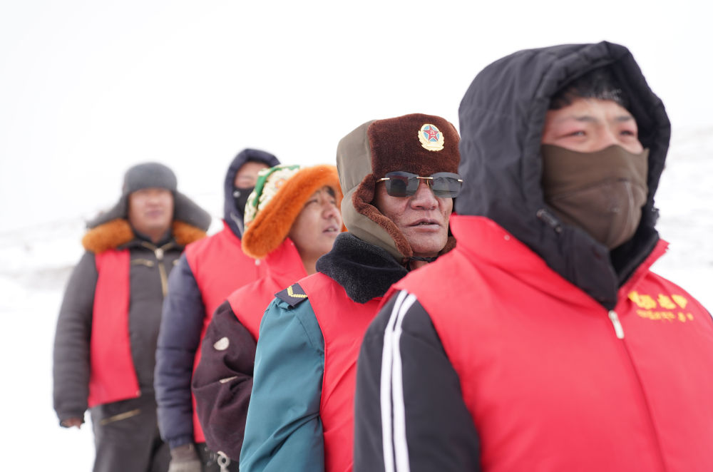瑪曲鄉(xiāng)長(zhǎng)江源黨員環(huán)保志愿隊(duì)年近七旬的才嘎老人(左二)在巡邏守護(hù)長(zhǎng)江源(2024年2月2日攝)。新華社記者 晉美多吉 攝