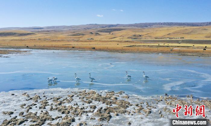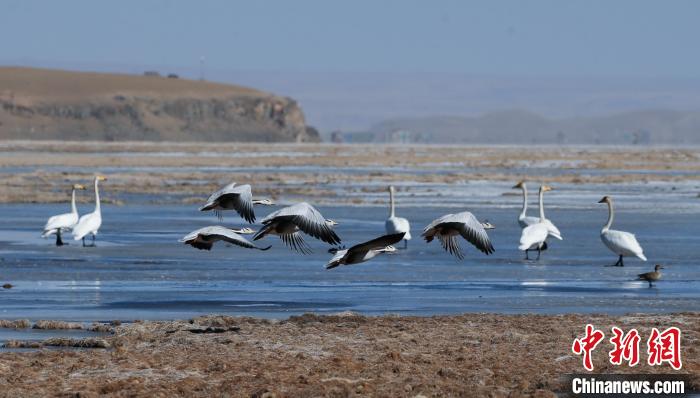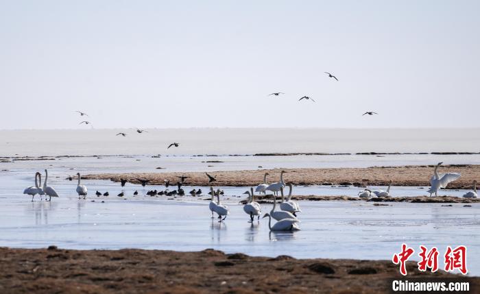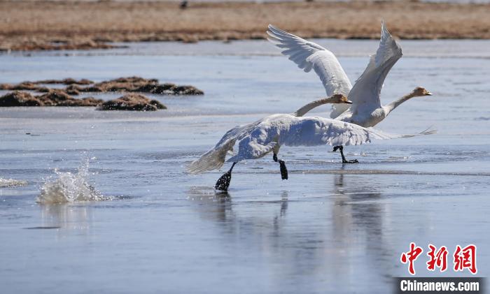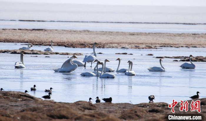 3月13日,青海省海南藏族自治州共和縣境內(nèi)的青海湖泉灣濕地,大天鵝沐浴春日暖陽。隨著天氣轉(zhuǎn)暖,大天鵝、斑頭雁、赤麻鴨等水鳥聚集在青海湖泉灣濕地,時而振翅飛翔、時而戲水覓食,鳴叫聲不絕,為仍處于冰封的青海湖增添生機(jī)和活力。