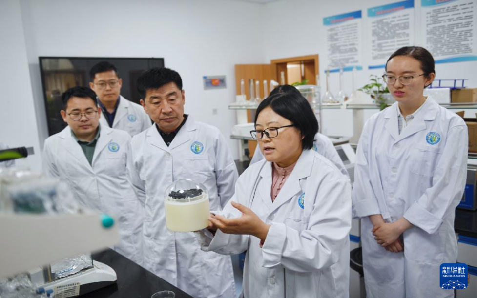 4月20日,在成都理工大學(xué)“四川省地質(zhì)環(huán)境脆弱區(qū)生態(tài)修復(fù)材料與技術(shù)工程研究中心”內(nèi),裴向軍(左三)及團(tuán)隊(duì)成員在展示其研發(fā)的光熱驅(qū)動(dòng)空氣集水材料及應(yīng)用模型。新華社記者 劉坤 攝
