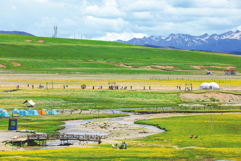 6月24日,記者一行乘車行駛在四川省阿壩藏族羌族自治州九紅草原風(fēng)光路紅原段,窗外掠過一幕幕美景:草原上遍地金黃色小花,小溪蜿蜒流過花叢,遠(yuǎn)處群山披著斑駁的“雪衣”。