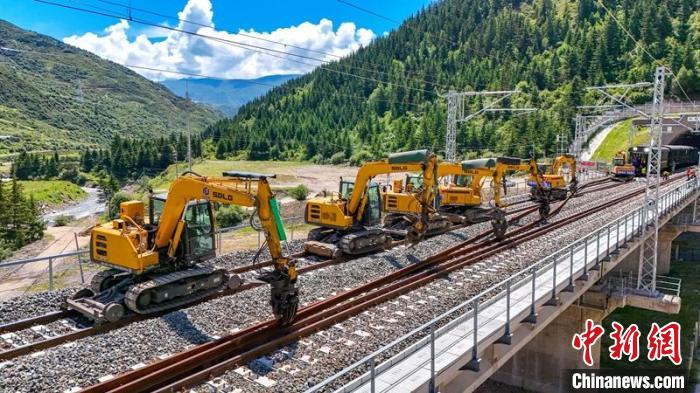 川青鐵路鎮(zhèn)黃段500米長軌鋪設(shè)采用“直鋪法”和“換鋪法”相結(jié)合的方式組織施工,無砟道床采取“直鋪法”施工,有砟道床采取“換鋪法”施工,利用工具軌鋪通右線,作為工程路料運(yùn)輸主線,同時(shí)兼顧左線鋪軌、長軌焊接鎖定及大機(jī)搗固穿插施工作業(yè)?!盀榇_保鋪軌安全有序推進(jìn),專門配置了HXN5型高原大功率內(nèi)燃機(jī)車等80余臺(tái)(輛)大型設(shè)備開展軌道施工作業(yè)。”張華稱,期間項(xiàng)目部合理分配資源,5天完成100公里長鋼軌鋪設(shè),12天完成100公里無縫線路單元焊接及放散鎖定工作。