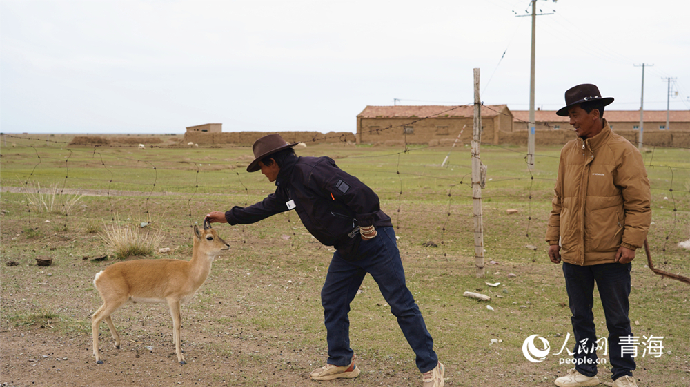 索南才讓和哥哥周增本(右一)與救助的普氏原羚“多杰”互動(dòng)。人民網(wǎng)記者 楊啟紅 攝