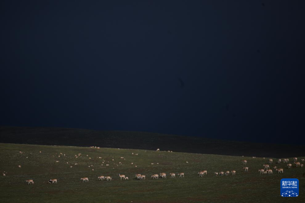 7月8日,在可可西里卓乃湖區(qū)域,一群藏羚羊在活動。新華社記者 張龍 攝