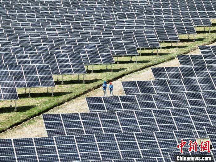 圖為國網(wǎng)青海電力工作人員正在例行巡檢4.4兆瓦村級光伏電站。馬清 攝