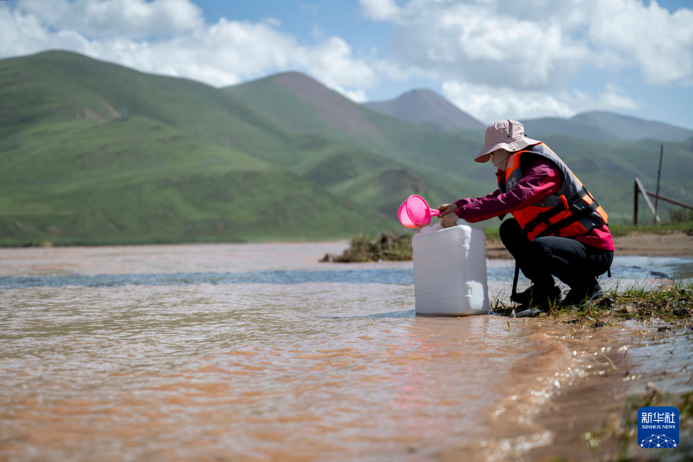 7月23日,青海省水文水資源測報中心的馬蕊在聶洽曲進(jìn)行水樣采集工作。新華社記者 伍志尊 攝