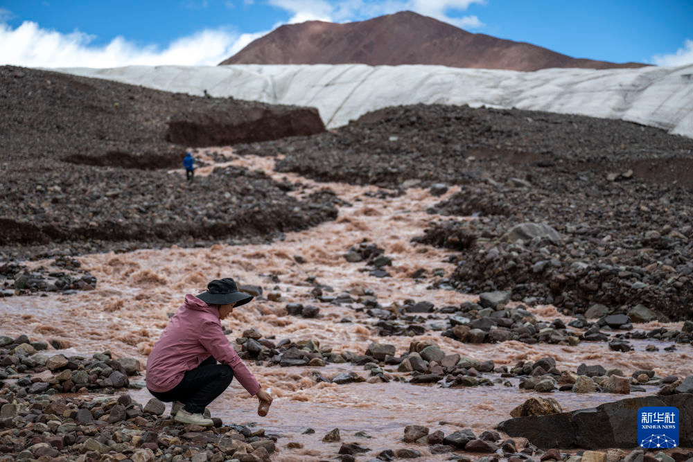 7月25日,科考隊員在冬克瑪底冰川進行水樣采集工作。新華社記者 伍志尊 攝