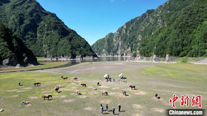 7月30日,海拔2610米的山頂峽谷中的天池冶海風景如畫。冶海位于甘肅省甘南藏族自治州臨潭縣境內(nèi),為高山堰塞湖泊。冶海藏語稱“阿瑪周措”,是安多地區(qū)三大圣湖之一,因其獨特的自然美景和歷史文化,吸引了眾多游客前來觀光旅游。圖為天池冶海邊的騎馬體驗區(qū)。(無人機照片)中新社記者 九美旦增 攝