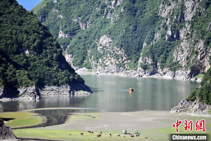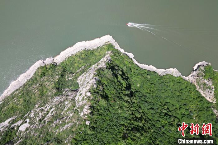 7月30日,海拔2610米的山頂峽谷中的天池冶海風景如畫。冶海位于甘肅省甘南藏族自治州臨潭縣境內(nèi),為高山堰塞湖泊。冶海藏語稱“阿瑪周措”,是安多地區(qū)三大圣湖之一,因其獨特的自然美景和歷史文化,吸引了眾多游客前來觀光旅游。圖為一艘快艇從冶海湖面駛過。(無人機照片)中新社記者 九美旦增 攝