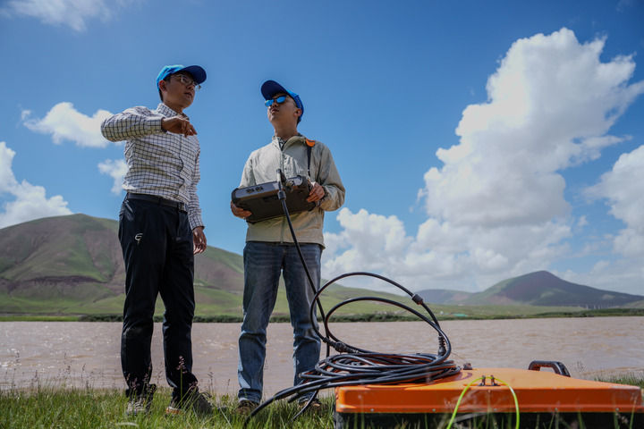 在長(zhǎng)江南源當(dāng)曲源,科考隊(duì)員在進(jìn)行流速測(cè)量(2024年7月22日攝)。新華社 潘彬彬 攝
