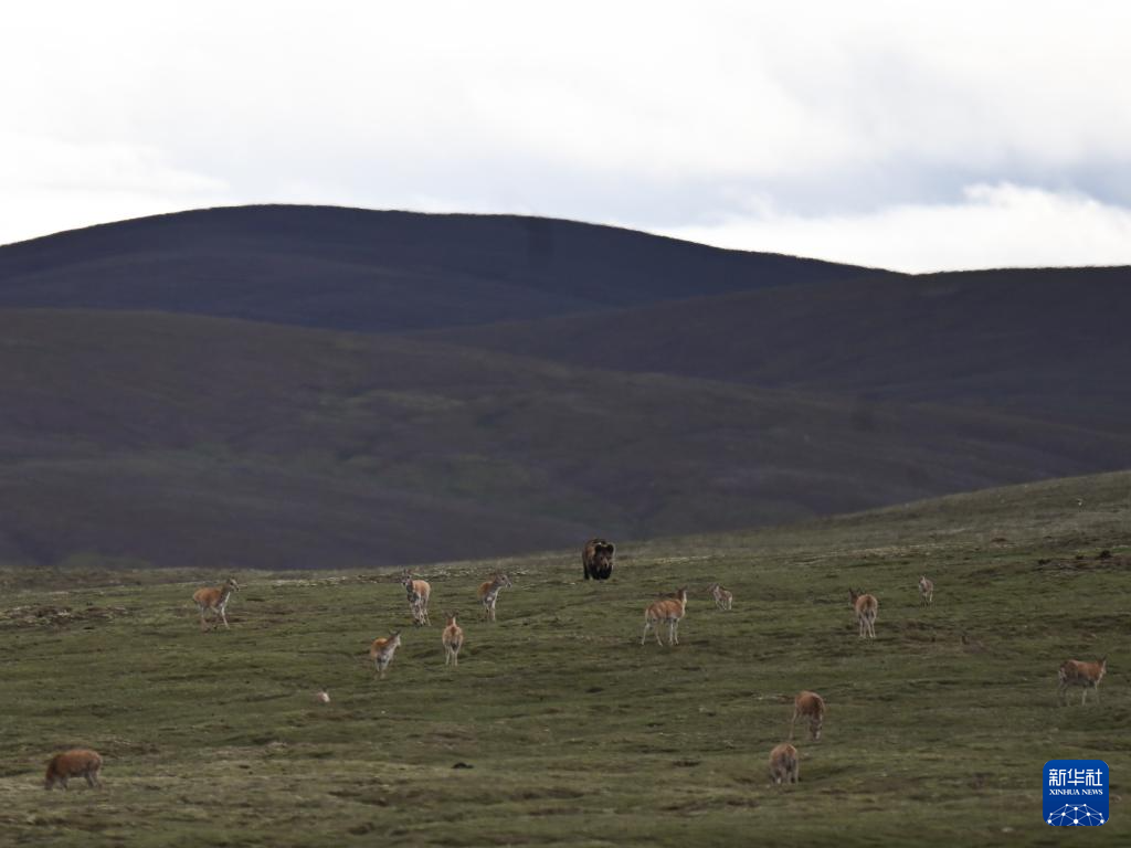7月7日,在可可西里卓乃湖區(qū)域,幾只藏羚羊在活動。新華社記者 張龍 攝