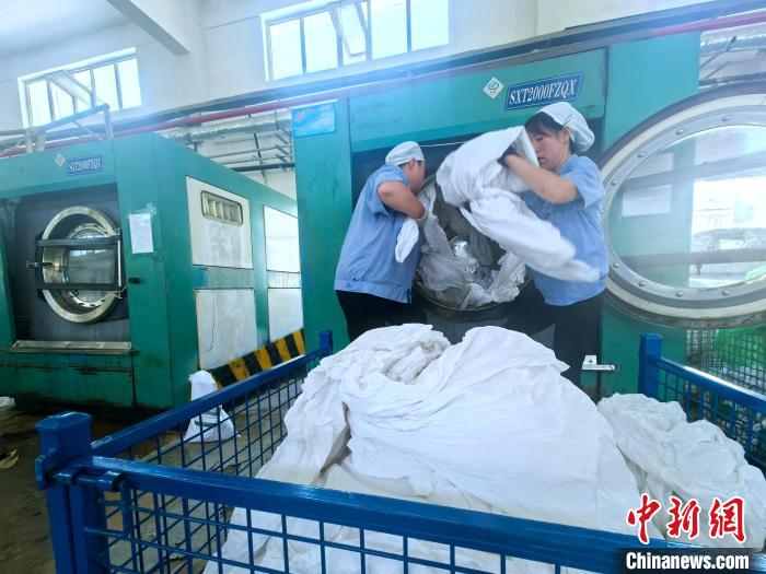 清晨的洗滌廠內(nèi),伴隨著機器的轟鳴聲,一股溫熱的濕氣撲面而來。清洗機內(nèi)轟轟隆隆,熨燙機上熱氣騰騰……