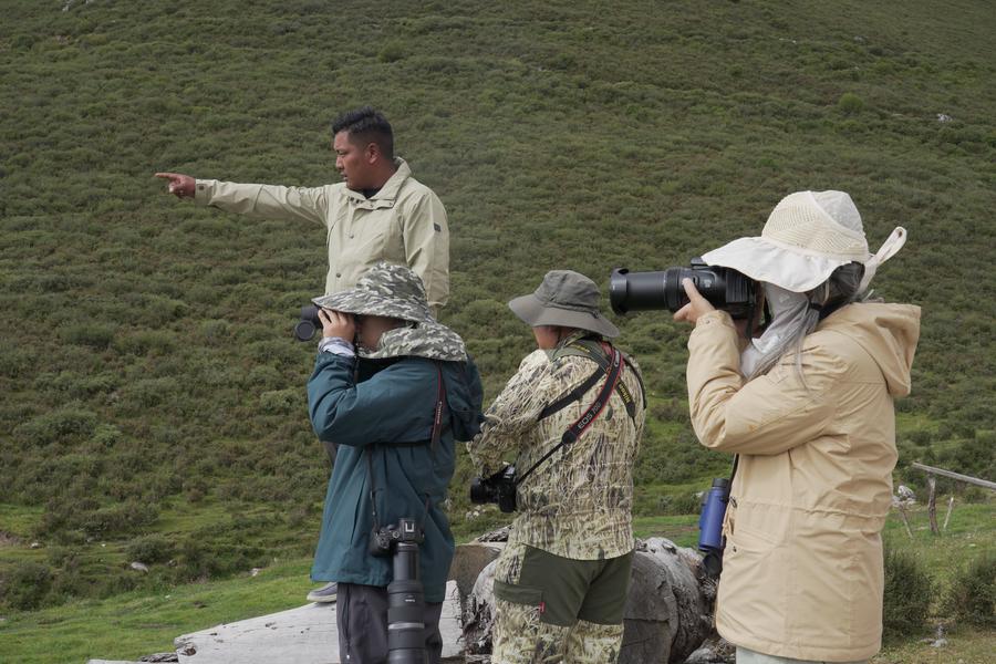 8月23日,在牧民向?qū)Вê螅┑膸ьI(lǐng)下,自然觀察者正在拍攝。新華社記者 柳澤興 攝