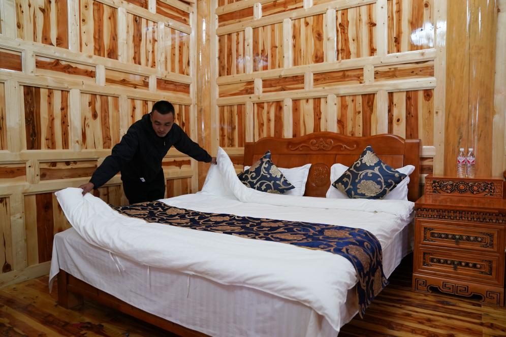 9月2日,在俄合拉村佐央之家民宿中,工作人員忙著整理床鋪。新華社記者 胥冰潔 攝