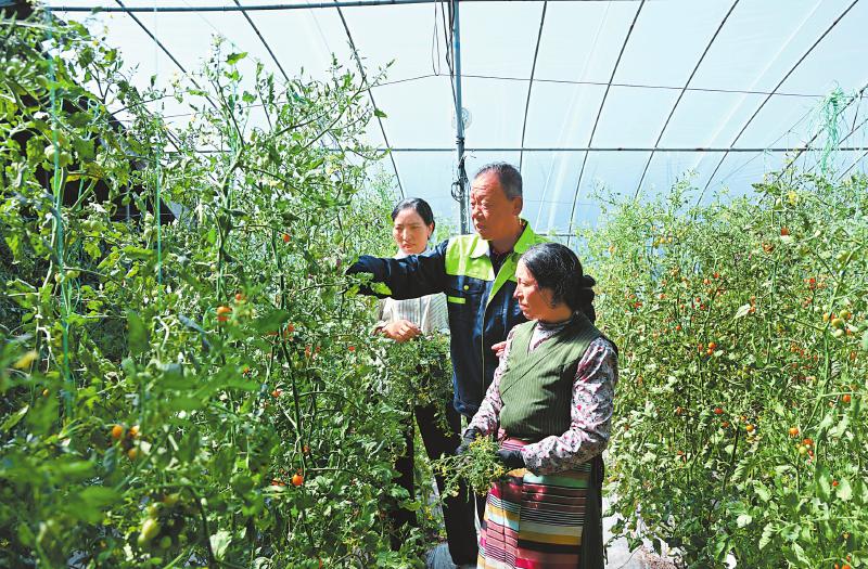在瑪吉阿米花園農(nóng)莊的大棚內(nèi),山東壽光來的劉振國(中)在指導(dǎo)栽培技術(shù)。四川日報全媒體記者 肖雨楊 攝