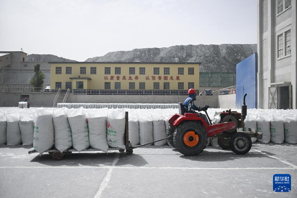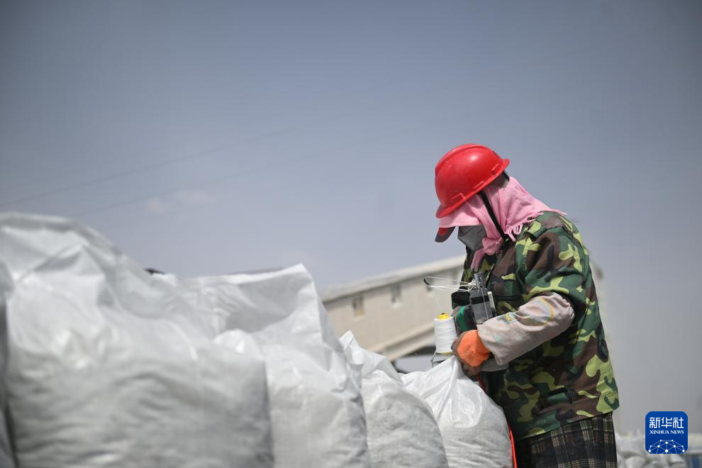 8月22日,在青海省海西蒙古族藏族自治州茫崖鎮(zhèn),青海創(chuàng)安公司工人在縫合石棉產(chǎn)品包裝袋。新華社記者 張龍 攝