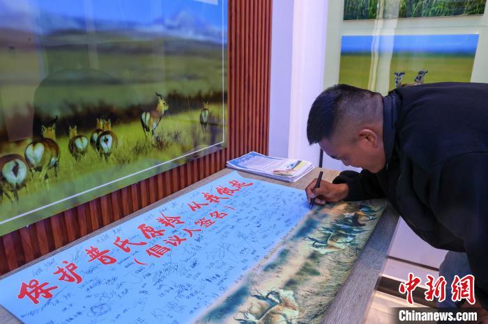 9月26日,在青海湖北岸的青海省海北藏族自治州剛察縣哈爾蓋普氏原羚科普研學(xué)教育基地內(nèi),參觀人員在保護普氏原羚倡議書上簽字。目前,中國國家一級重點保護野生動物普氏原羚野外種群數(shù)量從監(jiān)測之初不足300只恢復(fù)至3000余只。普氏原羚現(xiàn)僅分布于青海湖環(huán)湖區(qū)域,其中,以剛察縣哈爾蓋河流域最為集中。中新社記者 薛蒂 攝