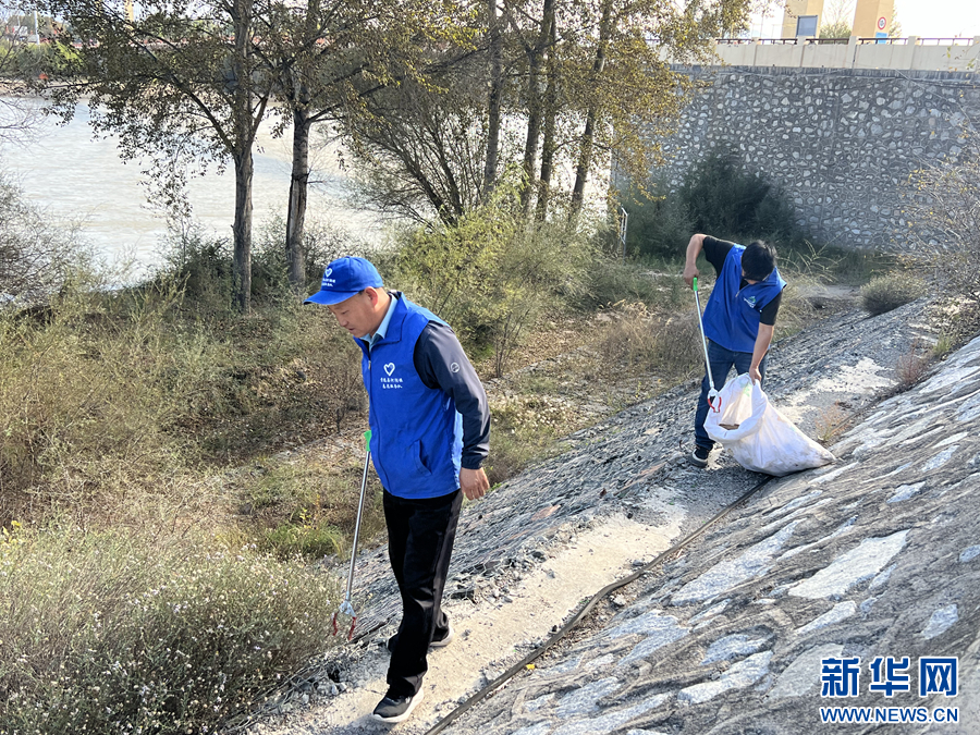 閆貴元(前)在黃河岸邊撿拾垃圾。新華網(wǎng) 魚(yú)昊 攝