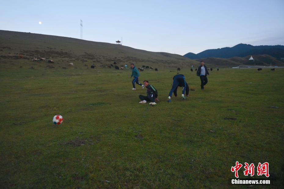 10月15日,在甘肅省甘南藏族自治州合作市一牧場內(nèi),甘南九二聯(lián)隊足球隊員進行訓練。該足球隊已成立32年,由牧民、務工者、歌舞演員、個體戶、老師、學生等組成,如今已歷經(jīng)三代球員的成長。