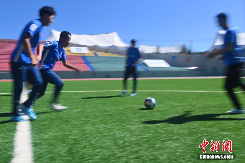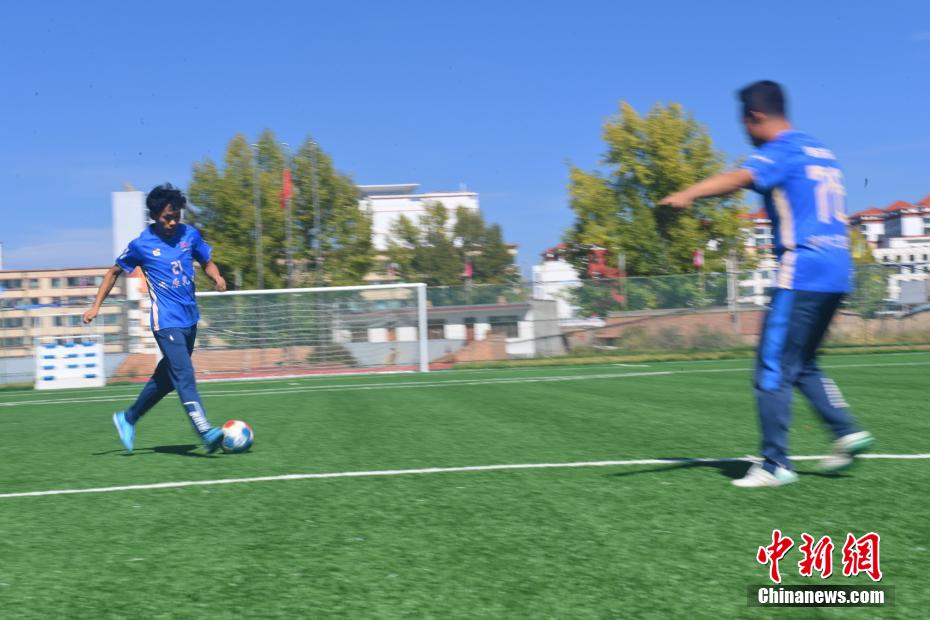 10月15日,在甘肅省甘南藏族自治州合作市一足球場內(nèi),甘南九二聯(lián)隊足球隊員進行訓練。