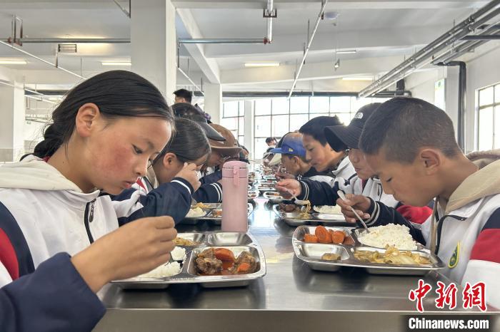 近日,色達(dá)縣中學(xué)東校區(qū),學(xué)生們在食堂用餐。中新社記者 王鵬 攝