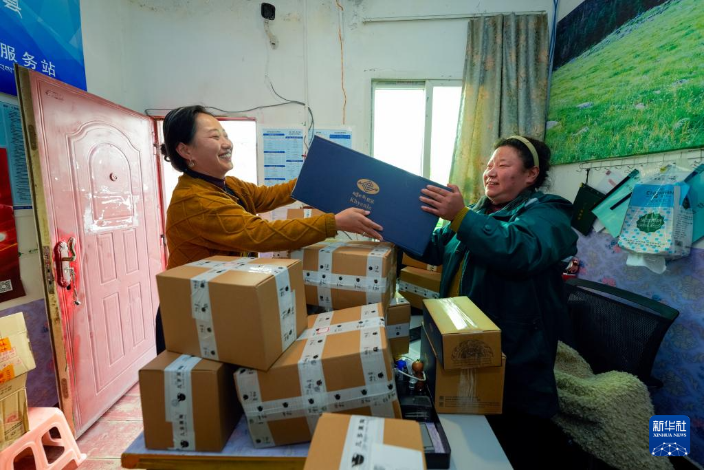 達(dá)瓦卓瑪(左)在家附近的郵政物流快遞服務(wù)站郵寄訂單貨品(11月4日攝)。新華社記者 沈伯韓 攝
